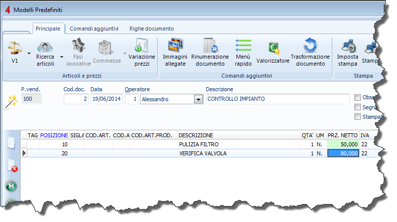 Se è necessario codificare del magazzino dei modelli di testo che possono essere composti da voci di magazzino, testi liberi e/o “note estese”, è possibile crearli all’interno del menù “Vendite e acquisti” – “Modelli predefiniti” .