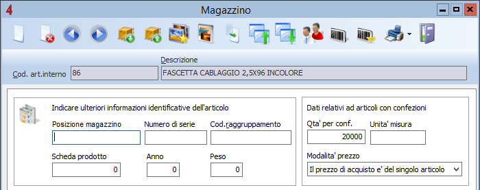 A questo punto si dovrà accedere alle schede degli articoli di magazzino di nostro interesse, selezionare la pagina “Dati aggiuntivi” e inserire la quantità per confezione (il numero di pezzi contenuti nella confezione) e la “modalità prezzo” (indicare se il prezzo di acquisto si riferisce alla confezione o al singolo pezzo).