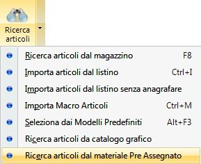 In entrambi i casi sarà sufficiente entrare nel DDT e cliccare su “Ricerca articoli” – “Ricerca articoli dal materiale preassegnato”.