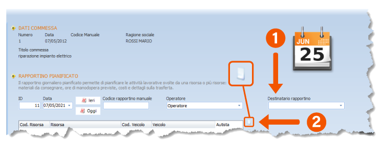 Il rapportino pianificato consente di programmare le attività svolte da una o più risorse, indicare le ore di manodopera previste per uno specifico intervento e indicare le informazioni su un’eventuale trasferta.